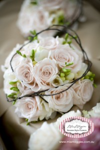 The colour is called “Champagne” and it can be described a few ways; sometimes as a very pale pink or a pale, peachy cream colour. It’s a really soft colour too, so it’s great for brides that want a hint of colour but do not want to be over taken by stronger coloured flowers. In between the roses are white freesias which smell so fresh and beautiful. For this bouquet, we haven’t used any foliage at all but what’s a little different is that the we used artificial doda vine to wrap over the brides maid’s bouquets to add a more rustic feel to the bouquets.